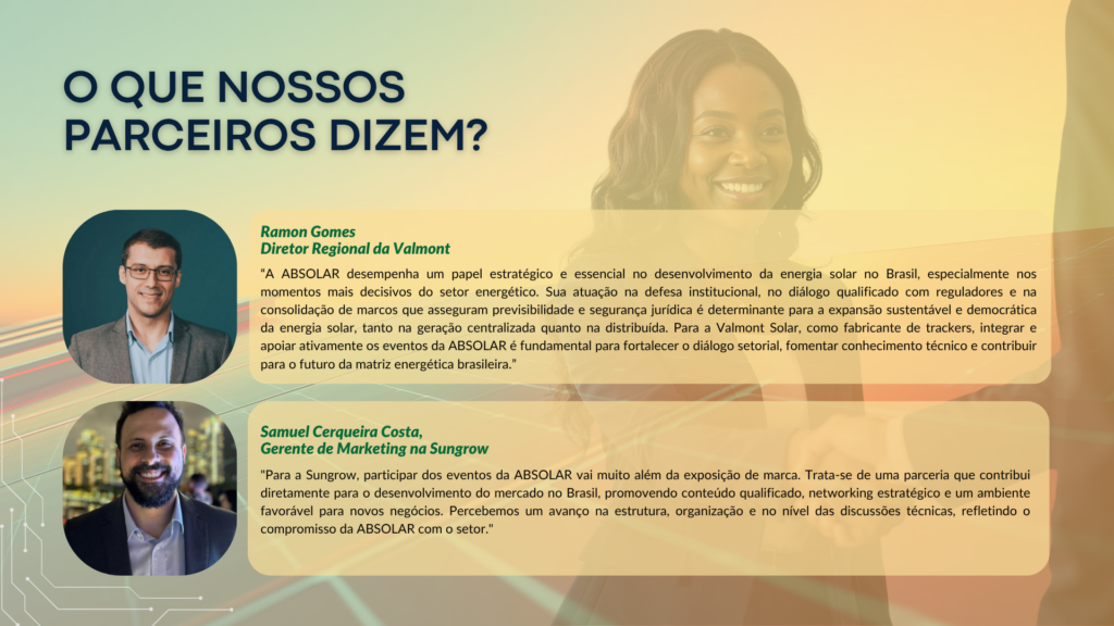 A ABSOLAR é reconhecida por realizar eventos de sucesso, com alto nível de satisfação dos parceiros e participantes. Conteúdo de primeira linha, organização e qualidade do público são seus principais diferenciais. Sua empresa não pode ficar de fora!